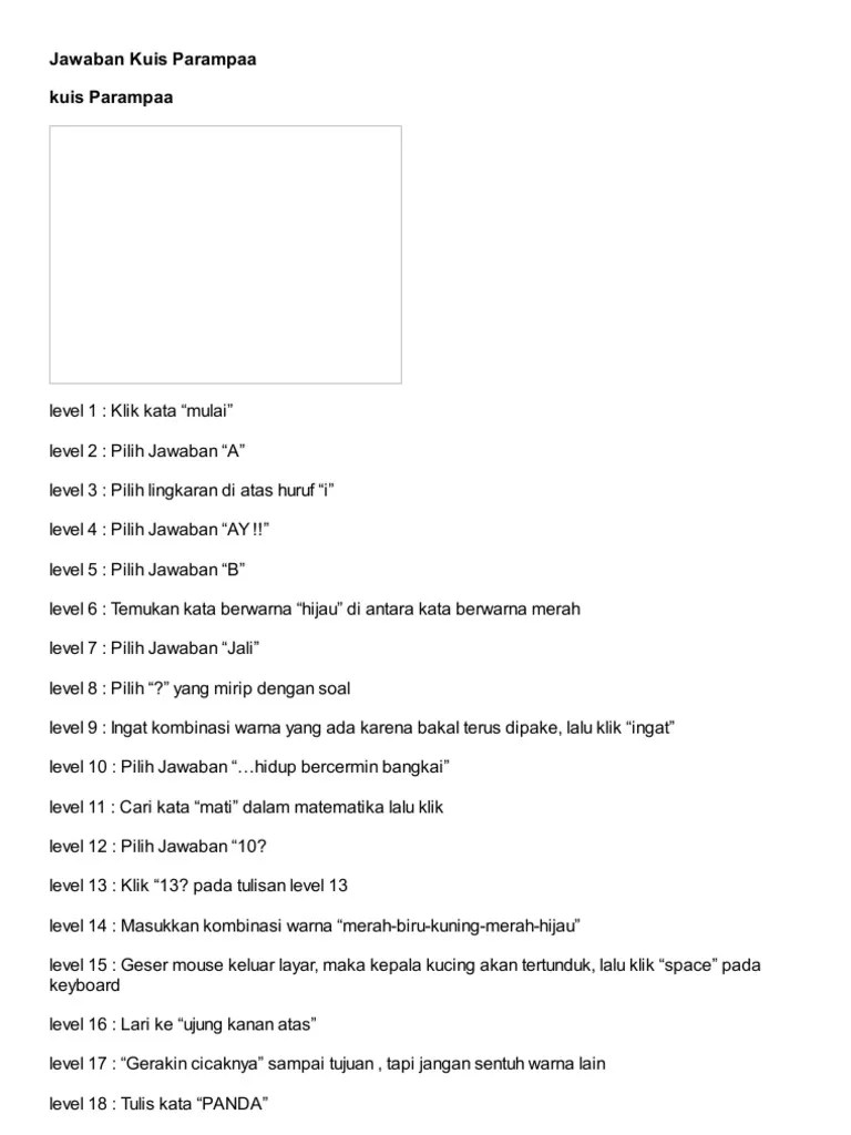Cheat kunci jawaban quiz parampaa. Cheat lengkap game quiz parampaa 1 dan quiz parampaa 2. Kunci jawaban quiz parampaa 1 dan 2 password lengkap. Karna ga ngerti ngikut aja deh) 3. Tahan kiri biar gk game overlevel 102 : Level 2 g a kata orang ini soal kunci kunci . Level 3 titik dihuruf i!4. Kunci jawaban quiz parampaa 2 ini bisa di bilang banyak karena saya merangkum lengkap dari level 1 sampai level 187 secara detail dan . Klik this levellevel 104 : Klik this levellevel 104 : Tahan kiri biar gk game overlevel 102 : Kondisi paritas pada keuangan internasional dan pemrakiraan nilai tukar. Level 160 knp ya kadang2 ga bisa diklik go malah disuruh coba lagi pdhl ane udh ngetik bener.